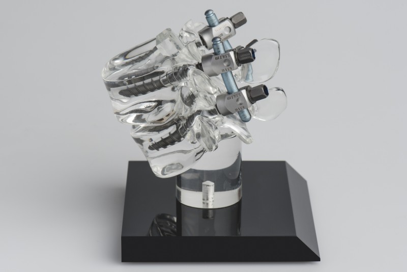 Modell der Wirbelsäule mit vier Pedikelschrauben zur Wirbelsäulenstabilisation (Foto: Pascal Gugler für Insel Gruppe AG)