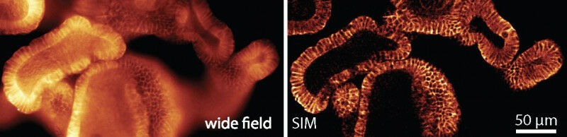 Illustration des optischen Trenneffekts mit der openSIM. Bei der Großfeldaufnahme ist das außerfokussierte Licht im Bild sichtbar, während bei der openSIM-Aufnahme nur der direkt fokussierte Teil der Probe sichtbar ist. Probe: Fixierte Darmorganoide von Mäusen, die mit E-Cadherin markiert sind
