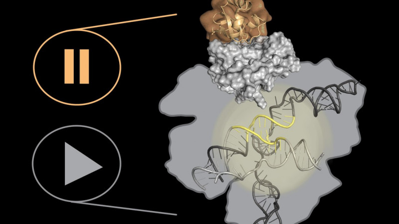 La protéine AcrX synthétique (en orange) agit comme un bouton pause donnant un plus grand contrôle sur l'édition du génome CRISPR-Cas9 (en gris)