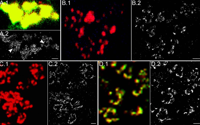 Frappanter Unterschied zwischen den Aufnahmen A.1 bis D.1 mit dem herkömmlichen Lichtmikroskop und den Bildern A.2. bis D.2. mit dem hochauflösenden Mikroskop. Die