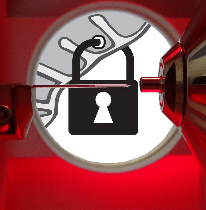 Vergrösserung einer Elektrospray-Kapillare (links), die Proteine in die Öffnung eines Massenspektrometers überführt (rechts). Mithilfe dieser Technologie analysierten die Forschenden Mitochondrien mit einem für Proteine verschlossenen «Tor» (Cartoon) auf molekularer Ebene.
