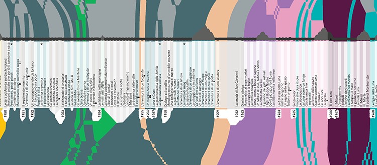 L’une des visualisations proposées par le projet Atlante Calvino retrace l’histoire éditoriale des quelque 200 récits de l’auteur, de leur première parution dans un journal ou une revue à leur publication dans des recueils, en permettant de suivre les flux et les changements qui s’opèrent à travers le temps.