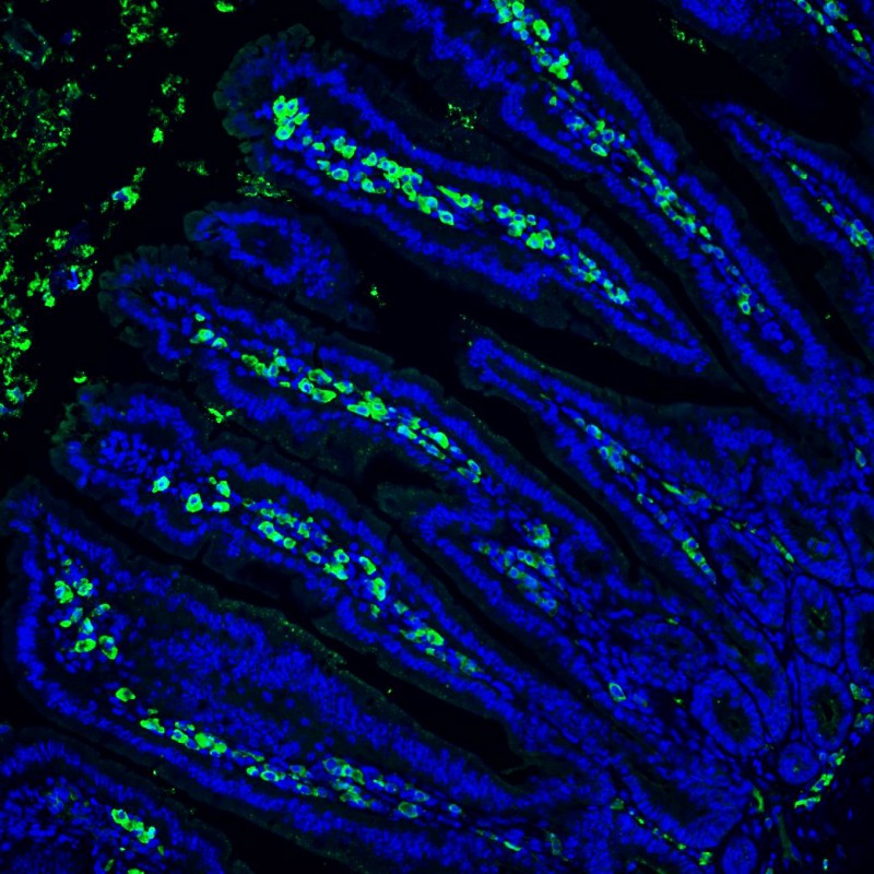 Dünndarmschleimhaut von keimfreien Mäusen mit IgA-produzierenden Plasmazellen (grün). Brigham & Women’s Hospital, Harvard Medical School