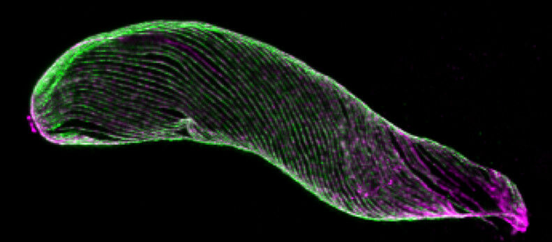 Plasmodium au stade ookinète observé par microscopie à expansion. L'image montre le cytosquelette de l'agent pathogène grâce au marquage de la tubuline qui le compose. Le conoïde est l'anneau visible à l'extrémité supérieure de la cellule. UNIGE/HAMEL - Des équipes de recherche de l'Université de Genève ont découvert le vestige d'un organite appelé conoïde sur le cytosquelette des parasites responsables de la malaria. Initialement considéré comme absent de cette espèce, il pourrait être impliqué dans l'invasion de l'hôte. Le Plasmodium est l'agent responsable du paludisme, une des maladies parasitaires les plus meurtrières. Au cours de son cycle de vie et de reproduction entre ses deux hôtes - le moustique anophèle et l'être humain - ce parasite prend plusieurs formes qui impliquent la réorganisation drastique de son squelette.