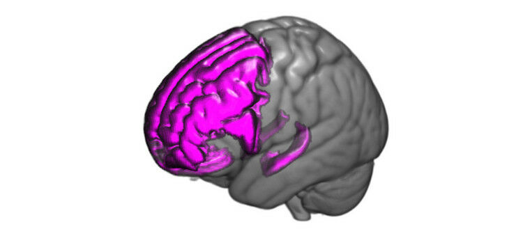 Le lobe frontal et l’hippocampe (en violet) sont parmi les zones principalement touchées par une dégradation due aux maladies psychotiques. Le traitement par des inhibiteurs sélectifs de la recapture de la sérotonine semble avoir un effet neuroprotecteur sur la maturation de ces régions.