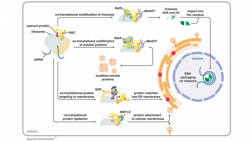 In their study, the researchers show that NAC brings two enzymes to the ribosome to first remove the first amino acid from the histone protein and then to modify the newly exposed end with an acetyl chemical group. Because histones are assembled very rapidly, these two processing steps must occur in the correct sequence and almost instantaneously.