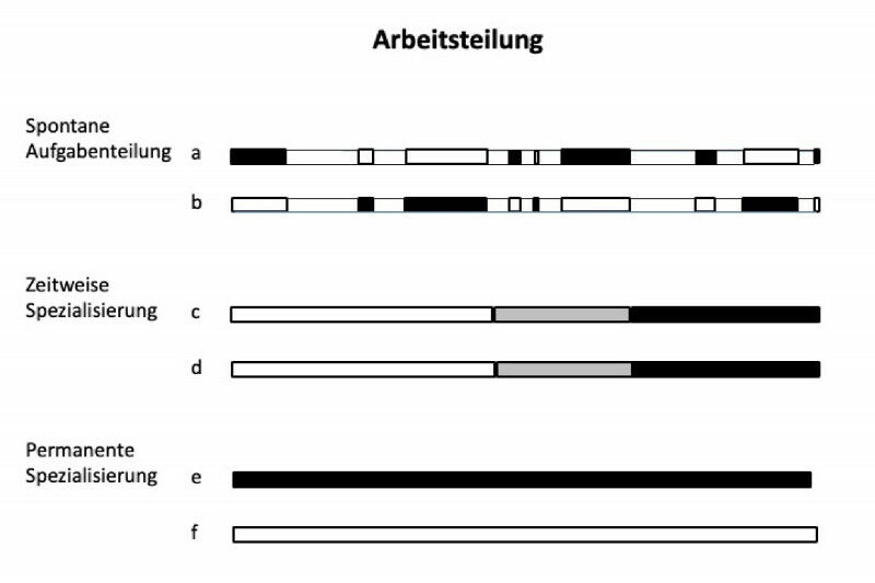 Nous pouvons distinguer trois formes différentes de division du travail : la division spontanée des tâches, la spécialisation temporaire et la différenciation tout au long de la vie", explique Michael Taborsky, docteur émérite de l’Institut d’écologie et d’évolution de l’Université de Berne et co-éditeur de l’ouvrage. Une répartition spontanée des tâches n’implique pas une spécialisation durable, et les avantages éventuels dus aux effets de l’expérience et de la pratique ne se font guère sentir. Il en va autrement lorsque les membres d’un groupe se spécialisent temporairement dans certaines activités. Chez les abeilles mellifères, par exemple, les ouvrières passent au cours de leur courte vie de tâches à l’intérieur de la ruche, comme le nettoyage des cellules et le nourrissage des larves, à des tâches à l’extérieur, qui comprennent l’approvisionnement en nourriture et la défense de la ruche. Pendant une certaine période, les ouvrières des abeilles se spécialisent donc dans certaines tâches, mais ne restent pas attachées à celles-ci toute leur vie. D’autres tâches, comme la reproduction d’une part et les activités de soutien d’autre part, sont fixées pour toute la vie. Les reines d’abeilles, par exemple, sont très performantes dans la production d’œufs, mais ne peuvent ni élever ni défendre leur couvain. Les ouvrières, en revanche, sont stériles et ne peuvent donc pas produire leur propre progéniture, mais elles sont en revanche très efficaces pour se procurer de la nourriture et élever leur couvain. Cette répartition des tâches, fixée à vie, constitue le ’système de castes’ des insectes sociaux, dans lequel chaque groupe assume certaines tâches essentielles à la survie de l’ensemble de la colonie.