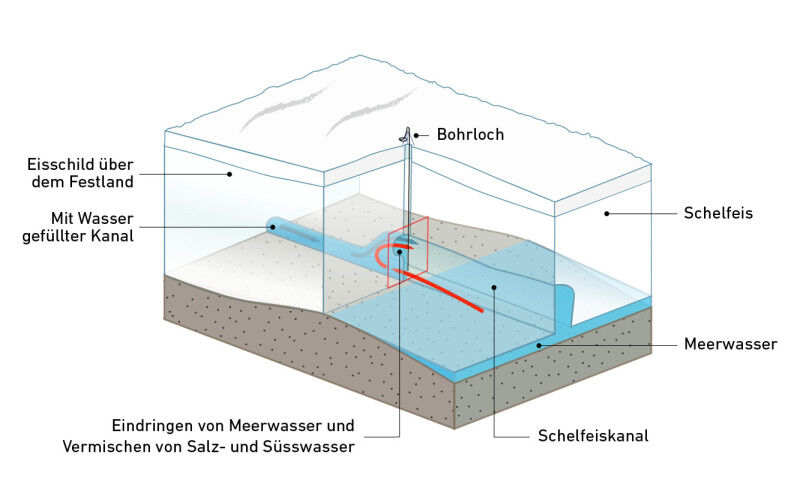 Mit der Bohrung durch den Eisstrom Kamb ist es zum ersten Mal überhaupt gelungen, einen solchen Wasserstrom, der in einer Höhle unter dem Eis auf den Ozean trifft, direkt aus unmittelbarer Nähe zu beobachten.