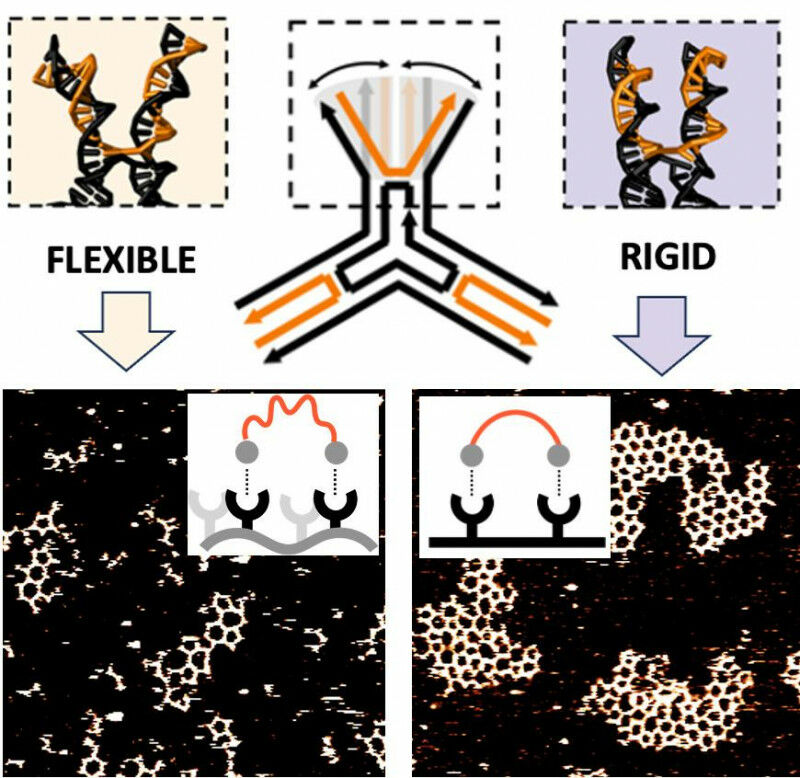 Like human DNA, the composition of the three-point star DNA molecules varied by their sequences of nucleotides, which affected their interaction strength (affinity) with neighboring molecules. But for this study, the researchers introduced an additional variable: through nuanced changes in the lengths of the strands making up each of the monomers’ three arms, they were able to modulate the arms’ local and global flexibility.Using high-speed atomic force microscopy, the team observed that the DNA stars with shorter, rigid ’arms’ organized into stable hexagonal networks, while those with longer, more flexible arms were unable to form any large networks. Simulations revealed that the short arms were nearly four times more likely to be arranged in a parallel shape more conducive to connecting with other molecules, while the longer arms tended to splay too far apart to create stable connections. The researchers termed this variation interface flexibility.