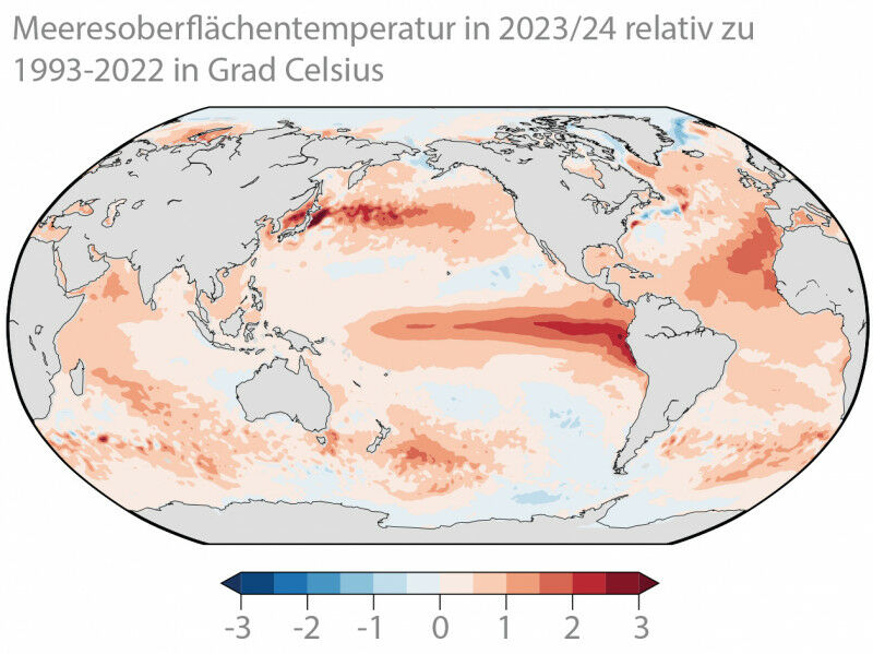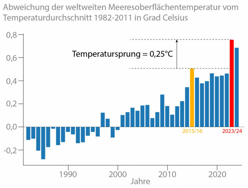 Die globalen Meeresoberflächentemperaturen erreichten zwischen April 2023 und März 2024 neue Rekorde und übertrafen alle bisherigen Höchstwerte um 0,25 Grad Celsius - so deutlich wie nie zuvor. Zahlreiche Forschende waren überrascht von der Grösse des Temperatursprungs, da das El Niño Ereignis, das einen wärmenden Effekt hat, in diesen Jahren nicht überdurchschnittlich ausgeprägt war. Aufgrund dieser Entwicklung vermuteten Forschende, dass neben dem Klimawandel und El Niño noch andere Faktoren eine Rolle spielen könnten, oder dass der Klimawandel schneller und stärker voranschreitet als bisher angenommen.
