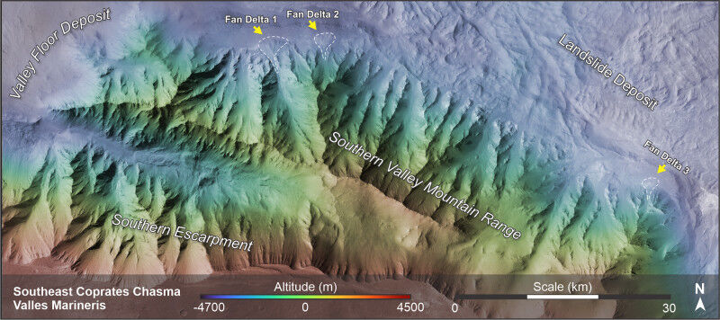 "When measuring and mapping the Martian images, I was able to recognize mountains and valleys that resemble a mountainous landscape on Earth. However, I was particularly impressed by the deltas that I discovered at the edge of one of the mountains," says Argadestya. At the lower end of the canyon system, so-called "scarp-fronted deposits" were discovered, which are interpreted as "fan deltas". Fan deltas form where a fan-shaped cone of debris and sand grows directly into a standing body of water. The researchers found that the structures mapped on Mars are very similar to classic deltas on Earth.