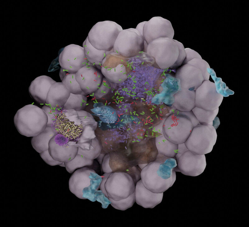 Reconstruction en microscopie électronique des différentes niches bactérienness. Credit: Sharma et al. EPFL - Des scientifiques de l'EPFL ont mis au point deux modèles complémentaires de vessie pour étudier les infections urinaires causées par E. coli: des organoïdes de vessie et une vessie sur puce. Les deux études montrent comment les bactéries envahissent la vessie, et comment elles échappent au système immunitaire et résistent aux antibiotiques. Les bactéries isolées dans la paroi de la vessie sont protégées par les neutrophiles. Credit: Sharma et al. Les infections urinaires font partie des infections bactériennes les plus courantes. Elles nécessitent généralement un traitement par antibiotiques, et près d'un quart des cas traités mènent à une infection récurrente.