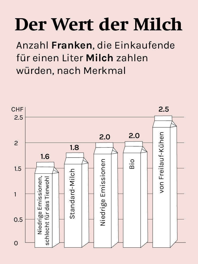 So liess sich herausfinden, welche Eigenschaften sie bevorzugen: Bio-Milch oder solche, die regional produziert wird? Ein Block Butter, dessen Herstellung weniger Treibhausgase verursacht hat, oder Butter von Kühen, die sich immer frei bewegen können?