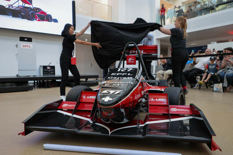 Deux membres de l'EPFLRT dévoilent Artemis au SPOT, le 25 mai 2022. Alain Herzog/EPFL - L'équipe a dévoilé mercredi soir sa nouvelle voiture de Formula Student électrique dans le nouveau makerspace de l'EPFL. Elle participera à quatre compétitions cet été en Europe. Après Orion et Mercury, c'est Artemis qui conduira l'EPFL Racing Team (EPFLRT) sur les circuits européens cet été. L'association d'étudiantes et étudiants a dévoilé mercredi soir sa nouvelle voiture de Formula Student, au SPOT, le nouveau makerspace modulaire de l'EPFL. Légère comme une moto, mais puissante comme une Golf, avec le rapport poids/puissance d'une Ferrari Enzo, monocoque et électrique, elle a été fabriquée de toutes pièces et montée de A à Z à l'EPFL. Il y a encore deux semaines, Artemis n'était que pièces détachées.