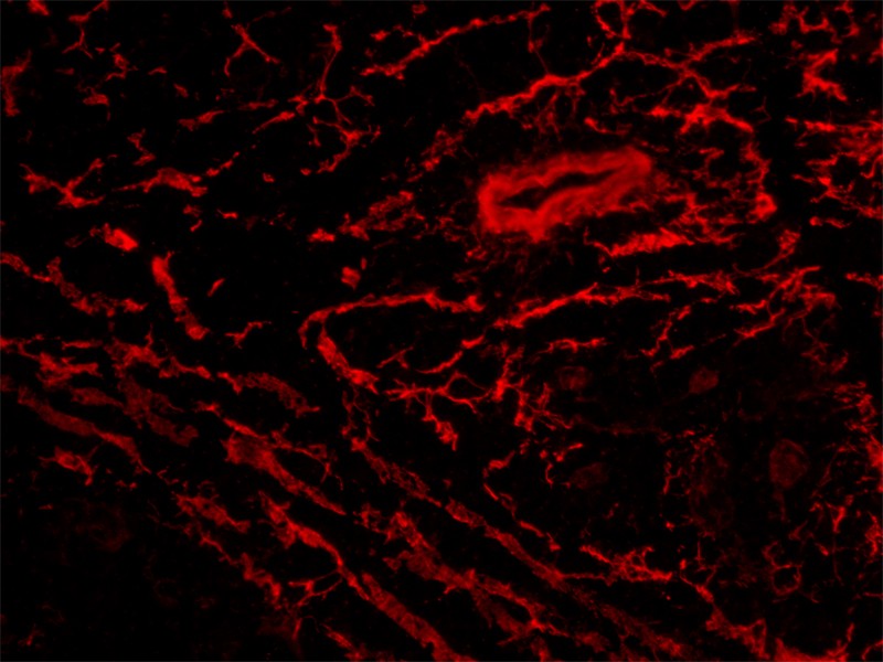 Querschnitt durch ein Leukämie-Geschwür (Chloroma), das aus Mäusen stammt, angefärbt mit Antikörpern, die an ein Angiogenese-Protein (rot) binden. Bild: Katrin Gutbrodt / ETH Zürich