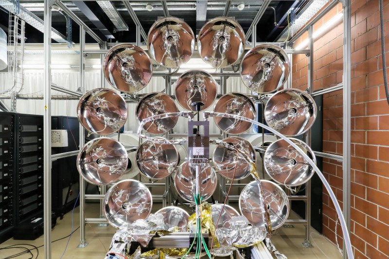 Dix-huit sources lumineuses, disposées en demi-sphère, permettent d'imiter avec une puissance et une précision inégalée, le rayonnement équivalent à plusieurs milliers de fois celui reçu sur terre depuis notre soleil. Mis au point par un Laboratoire de l'EPFL, elles permettent de tester divers matériaux en conditions extrêmes. Un article à ce sujet paraît aujourd'hui dans "Optics Express". Le flux lumineux équivalent à 20'000 soleils? L'énergie reçue pendant une journée dans le désert? La sortie d'un propulseur de fusée? Une intensité lumineuse telle qu'on la trouve dans l'espace, proche du soleil? Un laboratoire de l'EPFL parvient à reproduire la chaleur et la lumière du rayonnement solaire, avec une précision et une puissance inégalées. Utilisé pour tester des installations solaires, et des matériaux en conditions de température et de chaleur extrêmes, il permet d'avoir un aperçu complet en quelques heures, sans les aléas météorologiques. Les détails de cette installation font l'objet d'un article qui paraît aujourd'hui dans Optics Express . L'intensité de 21'700 soleils Le but de cette installation, mise au point en collaboration avec l'Australian National University et l'entreprise Kinoton Digital Solutions, est de parvenir à une lumière la plus intense possible qui peut varier avec finesse sans créer de chaleur inutile: cela pourrait endommager les matériaux testés.