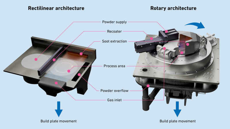 The heart of the new machine is a rotating platform that enables a high-speed printing process. Unlike conventional rectilinear laser power bed fusion machines, where a new layer of powder has to be applied after each layer is melted, the RAPTURE machine works non-stop thanks to its rotating platform. This means that powder is applied and fused by the laser simultaneously, which significantly enhances productivity. This reduces the manufacturing time for cylindrical components by more than two thirds.